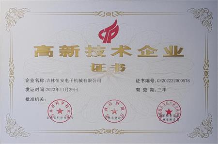 熱烈祝賀:吉林恒安電子機械有限公司在2022年吉林省科學技術(shù)廳高新技術(shù)企業(yè)評定工作中,榮獲高新技術(shù)企業(yè)證書。